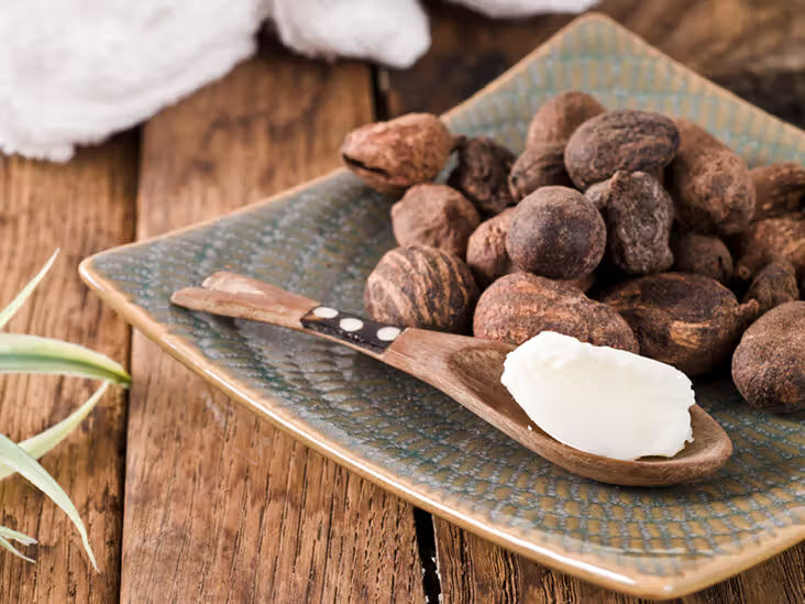 Sheasmør: Rik på essensielle fettsyrer som nærer, mykgjør og beskytter huden.